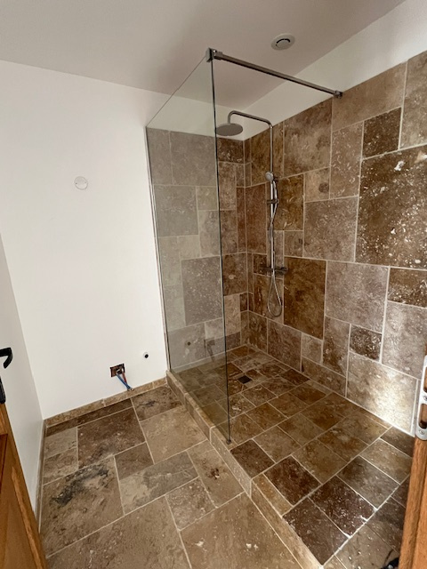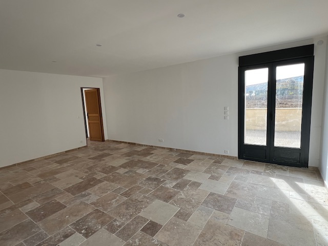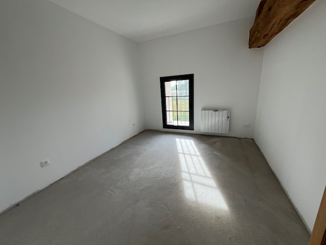 – Chauffage au sol, double vitrage alu, poutres cirées et brossées, travertin …